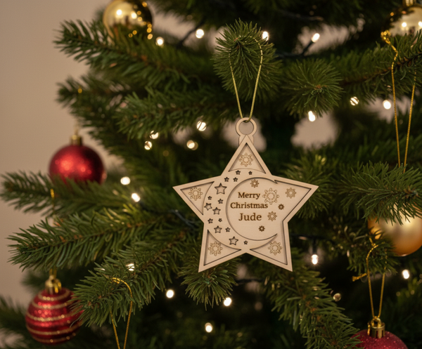 Bring a little extra magic to your festive celebrations with our 3D Star Personalised Wooden Tree Ornament.